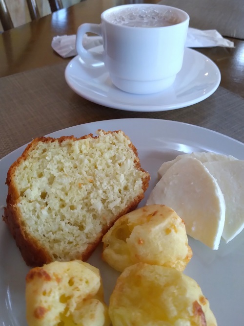 O que fiquei tinha cama de casal, mesinha com cadeiras, televisão, frigobar e ar condicionado. E curti bastante a piscina, que fica em uma área com uma pintura que dá um charme especial.